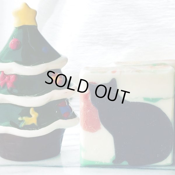 ナチュラルハンドメイソドソープ黒猫ちゃんのクリスマス (約80g) 猫ちゃんのシルエットをクリスマスカラーで包みました。プレゼントにも喜ばれると思います。特に優しい使い心地のスイートアーモンド油主成分保湿成分、補修成分満点のシアバターも豊富に使い香りはヤドリギをイメージしクリスマスの優しさをイメージしました。猫ちゃんのシルエットは竹炭より粒子の細かい麻炭使用。 ■材料スィートアーモンド油、パーム油、パーム核油、ひまわり油、シアバター、水酸化Na、精製水、クラリセージ、パルマローザ、シダーウッド、麻炭、レッドマイカ、二酸化チタン、グリーンマイカ、マイカスターゴールド *お肌に合わない時はご使用をおやめください。 グリセリンを豊富に含んだ石鹸です。 溶け崩れしやすいのでご使用後は水はけの良いところで保管ください。 *本品は薬事法上での石けん扱いではなく、雑貨(浴室用品、台所用品)扱いです。